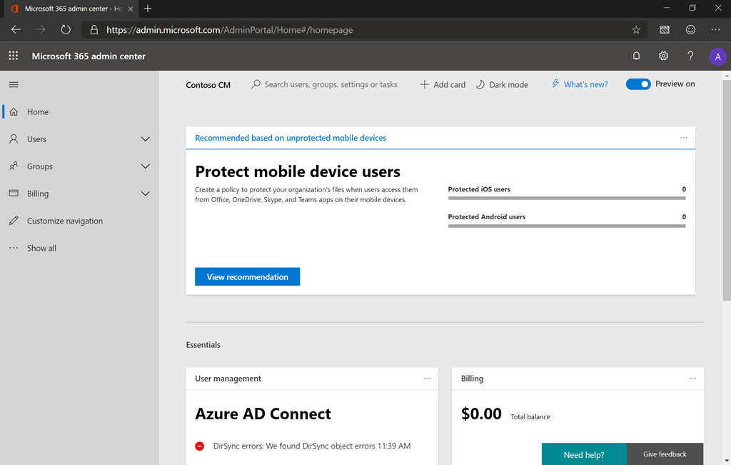 For people that perform other roles, there are two other focused portals of interest. The https://admin.microsoft.com portal focuses on billing and licensing, along with some high-level user and group management functionality.
