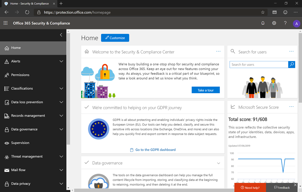 The https://security.microsoft.com portal (which ends up redirecting to an Office 365 page) focuses on what security and risk management people care about. From reading the blog about the introduction of this site, it appears this one is still a work in progress, as it doesn’t look like what’s described in the blog. (The blog does say that this would be rolled out gradually, finishing up world-wide in March, but it appears that was delayed.)