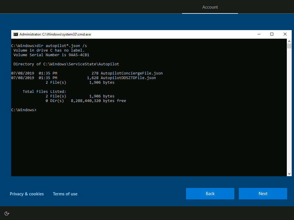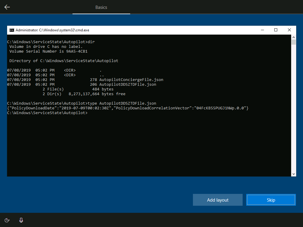 That takes us up to the point where the device would act on what it received in the Windows Autopilot profile – that specific behavior varies based on the scenario that you’ve chosen in the Windows Autopilot profile.  We’ll talk more about each one of those in the future.  For right now, let’s explore a little more about what this profile contains.  The easiest way is to look at one.  Conveniently, with Windows 10 1903 and above it will put the profile contents into a file: