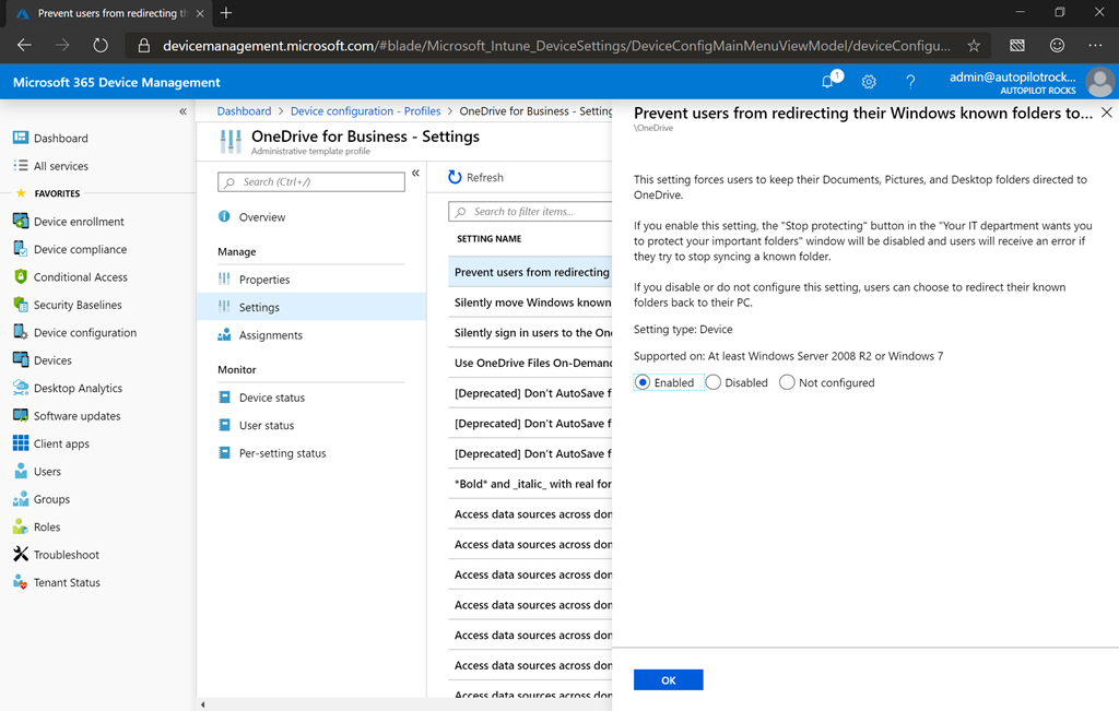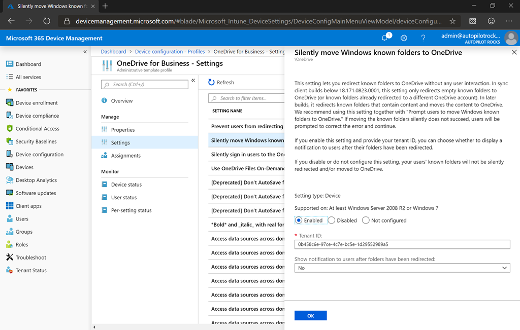 - Silently move Windows known folders to OneDrive. This makes sure that the Documents, Desktop, and Pictures folders are automatically synced to OneDrive. For new devices being deployed with Windows Autopilot, there’s nothing to migrate, so this just makes sure that the files synced from the cloud show up in the right place. (If you are applying this policy to an existing device, be aware that some file types cannot currently be migrated automatically. See the OneDrive documentation for more details.)