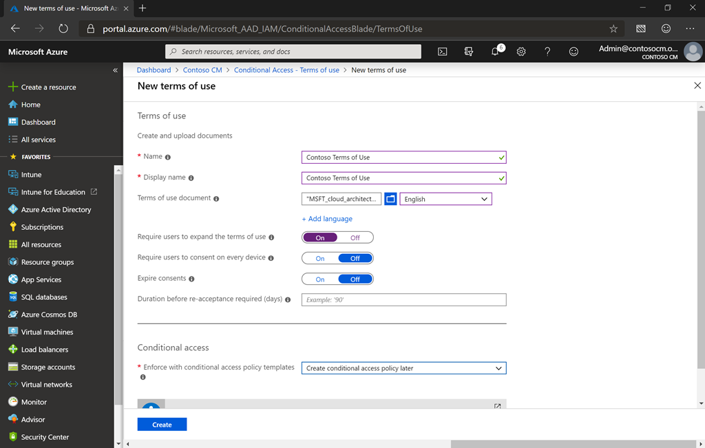 That points to an October 2018 blog post (migrated since then to the Tech Community website) that talks about a new Azure AD terms of use feature which has more capabilities: support for PDF files, localized versions, integration with Conditional Access, etc. That post then points to the Azure AD documentation page that describes how to set it up. So, I tried it, first deleting the Intune terms of use and then creating a new Azure AD Terms of Use policy with an (obnoxious) 7-page PDF file for the policy: