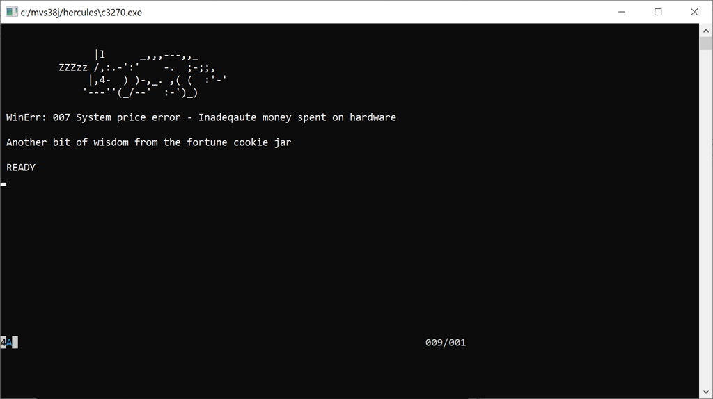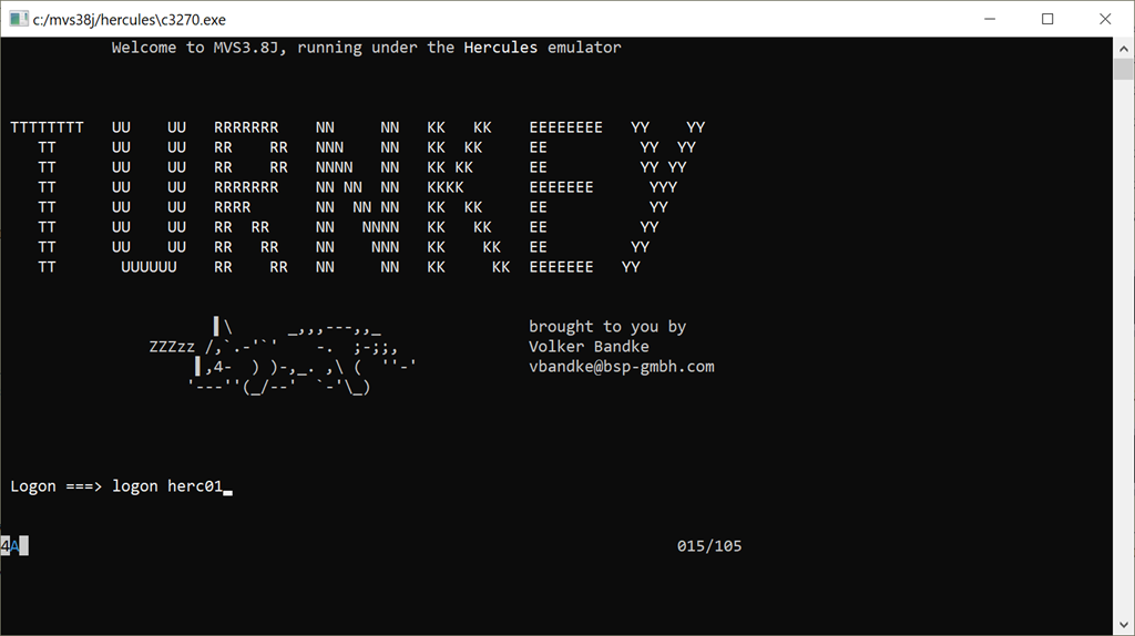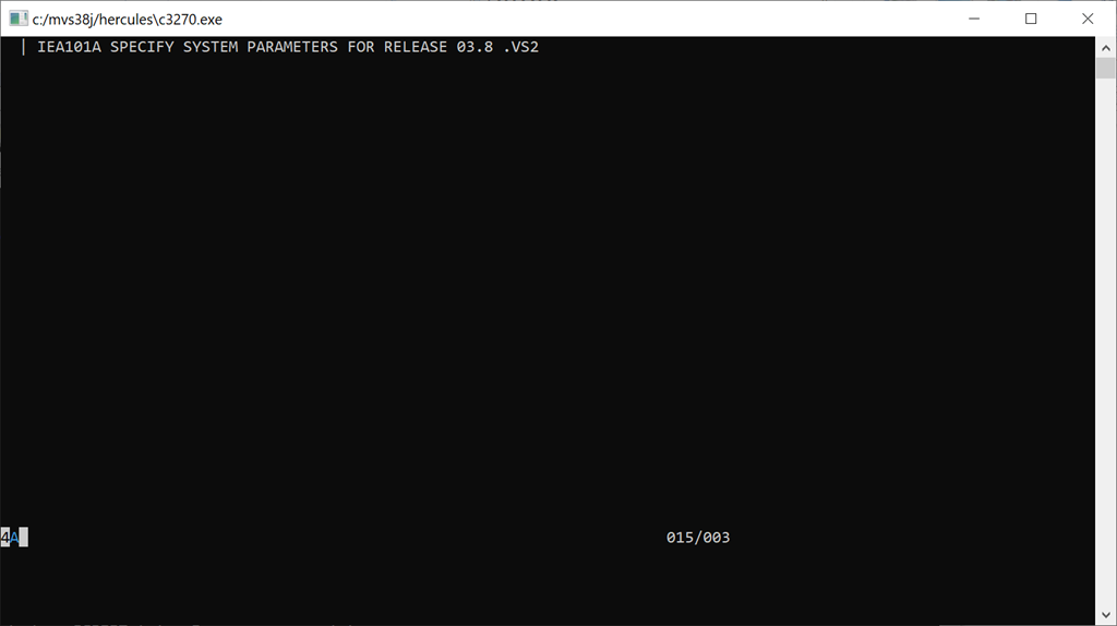 But from the docs at http://www.bsp-gmbh.com/turnkey/cookbook/opmvs.html#MVSIPL, that’s normal so you can just restart JES2 using “S JES2” and then tell it to format with “r 1,format”. A few confirmations later and the system is up and running, at which point you can sign in to a TSO session (“TSO” = time sharing option, basically one of the earliest shells):