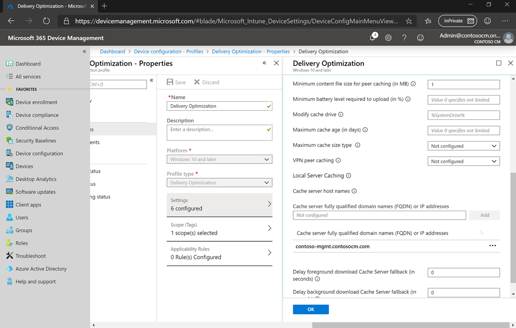 Then you can deploy as normal. I tried this out with Windows Autopilot, using a ConfigMgr-installed DOINC instance for persistent caching of content. As suggested in the Office documentation, I configured Delivery Optimization to cache smaller files (1MB and above):