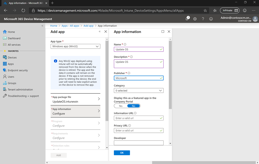 I’ve published a ready-to-use sample on GitHub at https://github.com/mtniehaus/UpdateOS. Download at least the UpdateOS.intunewin file (grab the whole repository if you want to make any tweaks), then add it to Intune as a new Win32 app. First, select the intunewin package: