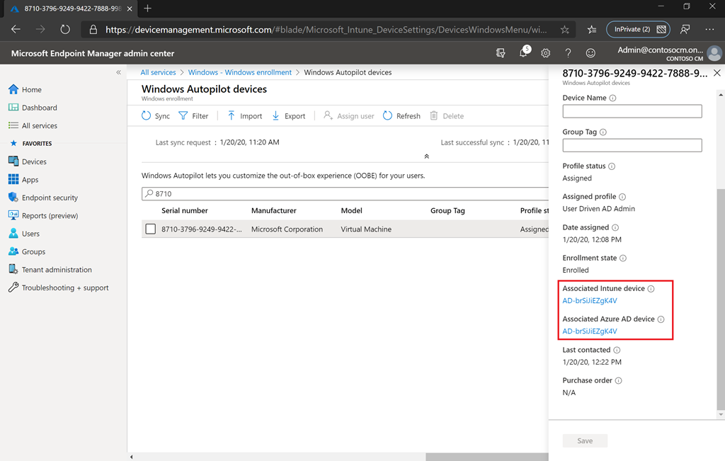 The device will boot up and ask for Azure AD credentials. These will be used to to enroll the device into Intune. Now you’ll see the Windows Autopilot device links to an Intune object: