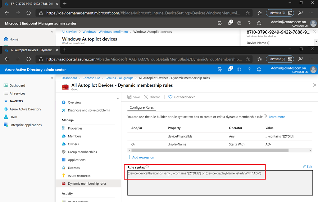 The most important device configuration profile for the Hybrid Azure AD Join process is the Domain Join profile. If the device being deployed does not have a Domain Join profile assigned to it, it will fail – the device will time out and eventually display an 80070774 error, indicating that it can’t contact a domain controller. That’s kind of deceptive, because it doesn’t even know what domain controller it needs to contact, because it never joined Active Directory in the first place. So how do you work around that? If you have a simple environment (like me) you can just target the Domain Join device configuration profile to “All devices” – then which device Intune uses doesn’t matter, all are in scope. If you have a more complex environment, you might have a dynamic group that you are using, maybe “All Autopilot devices.” You can modify that query to select both objects by looking for any devices with ZTDID set, as well as any devices whose name starts with your AD device naming prefix. In my case, my devices are all named starting with “AD-” so I can use a query like this:
