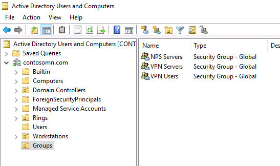 That takes us to the “Create the VPN Users, VPN Servers, and NPS Servers Groups.” I have skipped these before, because it’s possible to use existing groups (e.g. Domain Users) and a specific server instead of a group, but as I’ve skipped all the other sections so far, I might as well follow this one (it prepares you for a possible future where you have multiple servers and a desire to selectively allow access) creating three groups: