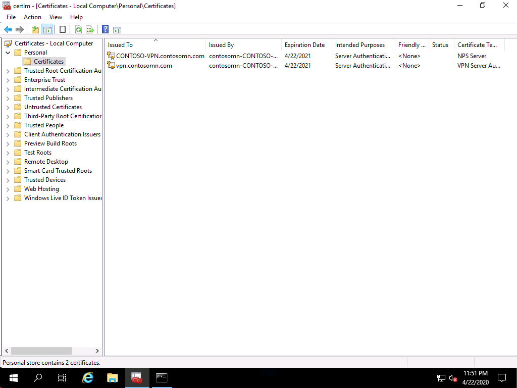 Also, if you haven’t rebooted your server since you added it to the VPN and NPS groups above, you might as well do that now – the cert enrollment will fail if you haven’t because the server’s computer account token doesn’t yet contain those groups otherwise.