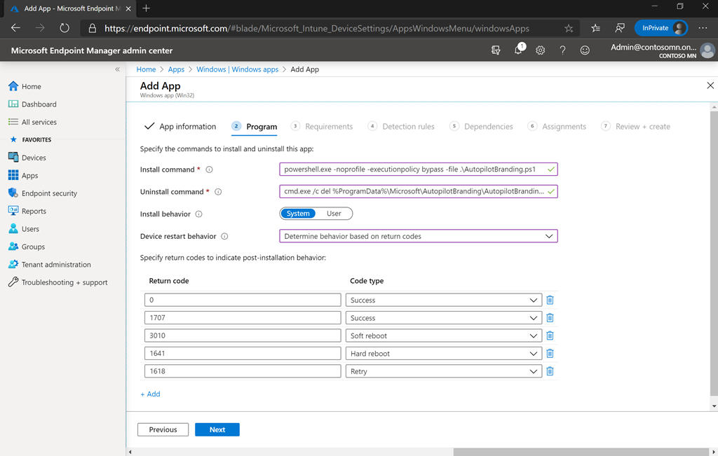 Install command: powershell.exe -noprofile -executionpolicy bypass -file .\AutopilotBranding.ps1