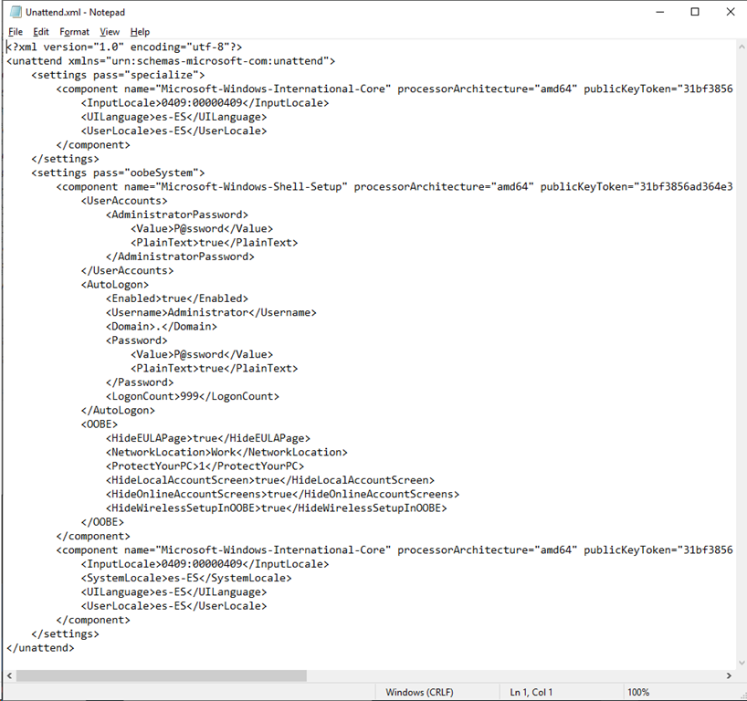 After that, I put an unattend.xml into the E:\Windows\Panther\Unattend folder containing this content: