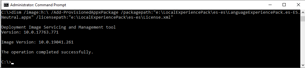DISM.EXE /image:E:\ /Add-Package /PackagePath:”F:\x64\langpacks\Microsoft-Windows-Client-Language-Pack_x64_es-es.cab”