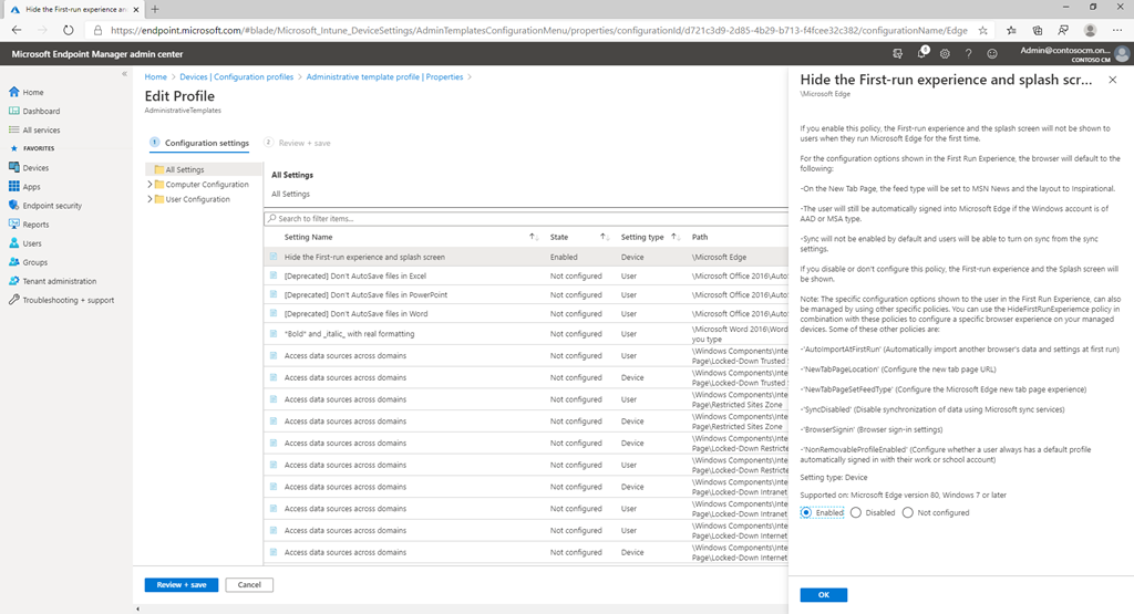 You can click the folder icon to upload the XML file.  Save the profile and assign it to an appropriate group of devices.  Assuming you’ve already done the Windows Autopilot configuration (registered the device, assigned a self-deploying profile, enabled ESP), you’re ready to deploy.  You’re then ready to deploy to a physical device (VMs aren’t supported for self-deploying mode due to the TPM attestation requirements).  And at the end of the process, you’ll see issue #1:  The Edge first run experience will show up and the browser isn’t full screen.  (Obviously the “—nofirstrun” parameter I tried to add to the Edge command line did no good.)  OK, easy enough to turn that off with an Administrative Templates profile: