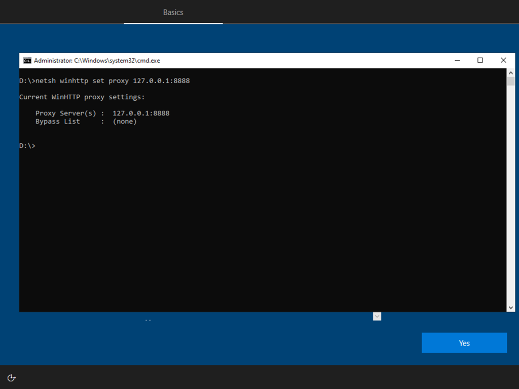 Mount that ISO into your VM and you’re set to go. When you first get into OOBE, you can press Shift-F10 to open a command prompt. From there, you can run FiddlerSetup.exe. Specify a short path, e.g. C:\Fiddler: