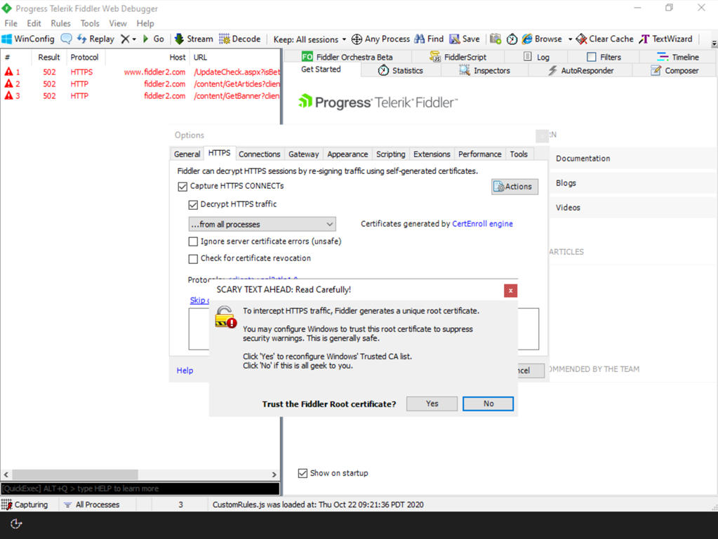 Next, from the Tools menu choose “Options.” Click on the HTTPS tab, and check the box that says “Decrypt HTTPS traffic.” That will cause some “scary dialogs” (yes, you should be doing this on a throw-away VM). First choose “Yes” to trust the Fiddler root certificate: