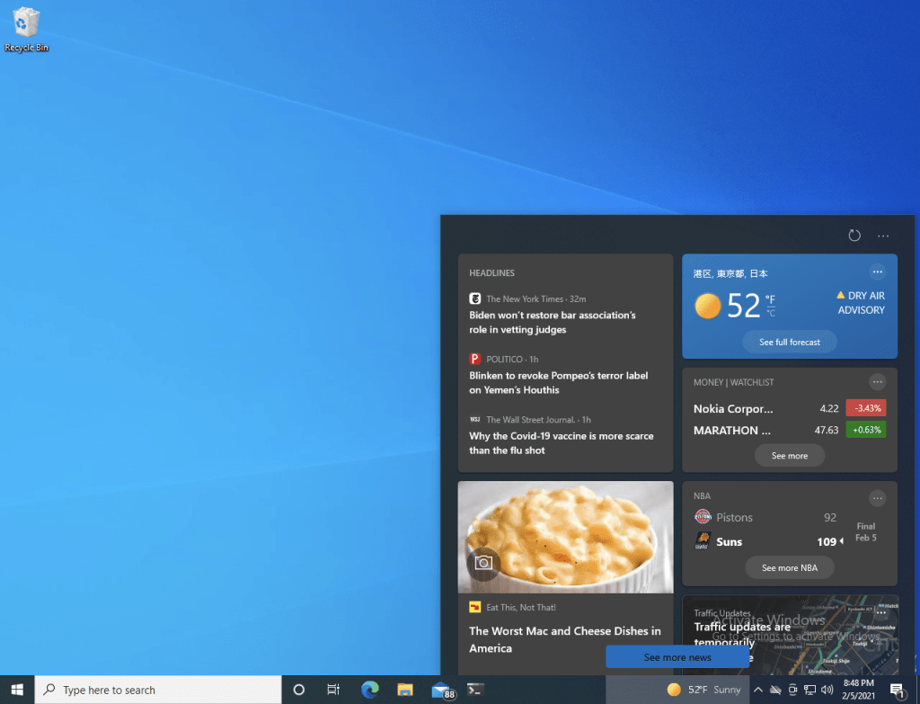 Don’t ask me why the weather location isn’t in English, or how it picks what it displays (which is very similar, if not identical, to what you would see in the new Edge new tab page). But it’s pretty much guaranteed that at least some organizations will want to turn it off — assuming the feature ever ships in a Windows 10 release. (The feature overall reminds me of Active Desktop, seems we’re heading back that direction…)