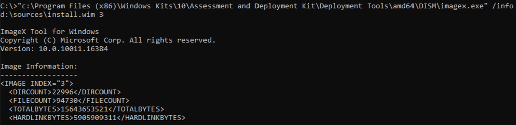 So what gives? Well, it appears that DISM is reporting the size consumed by all files, not taking into account the hardlinks that are used for pretty much every Windows 10 file, so as a result the size reported is about double what it should be. If you go back to the old ImageX.exe tool (which is still available in the ADK), you can see two different numbers, again for Windows 10 20H2: