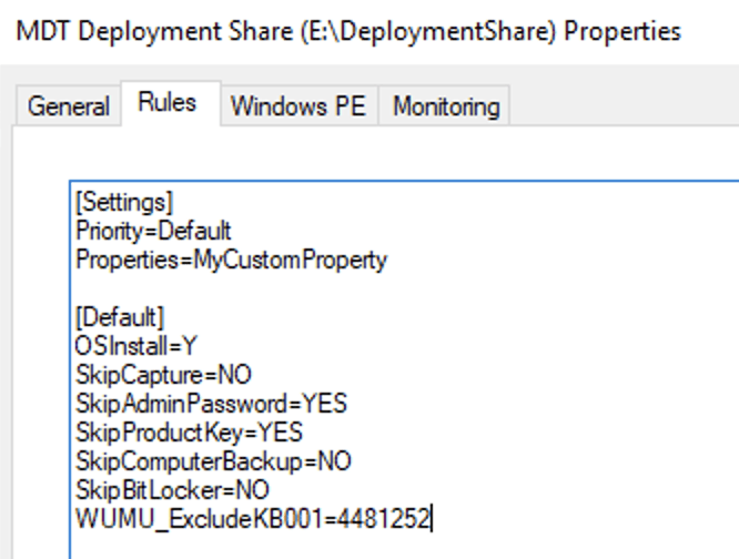 The net result is this modified wimscript.ini file (located in the Tools\<platform> folders on your MDT deployment shares), with the new files added: