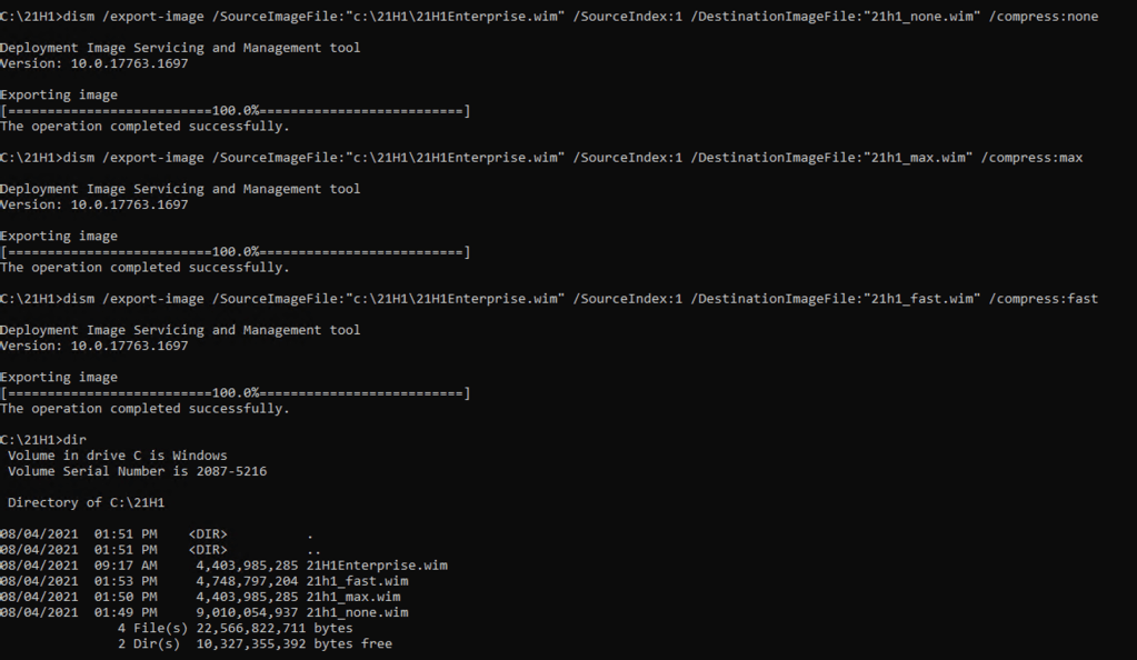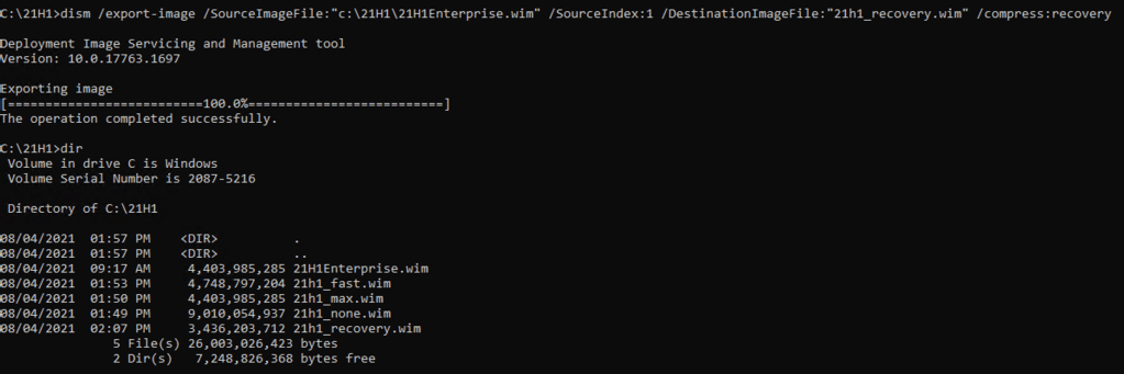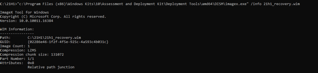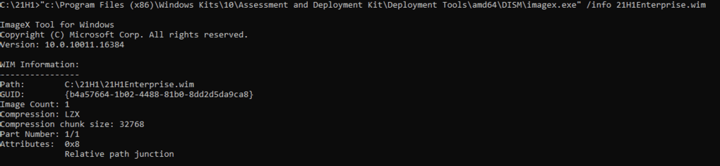 That saves a few hundred megabytes. An improvement, but still not great (e.g. it still doesn’t fit on a FAT32 USB key). So maybe it can be compressed better. First, let’s look at how it’s compressed, which sadly is most easily done using the (very) old IMAGEX.EXE utility, which is still included in the ADK: