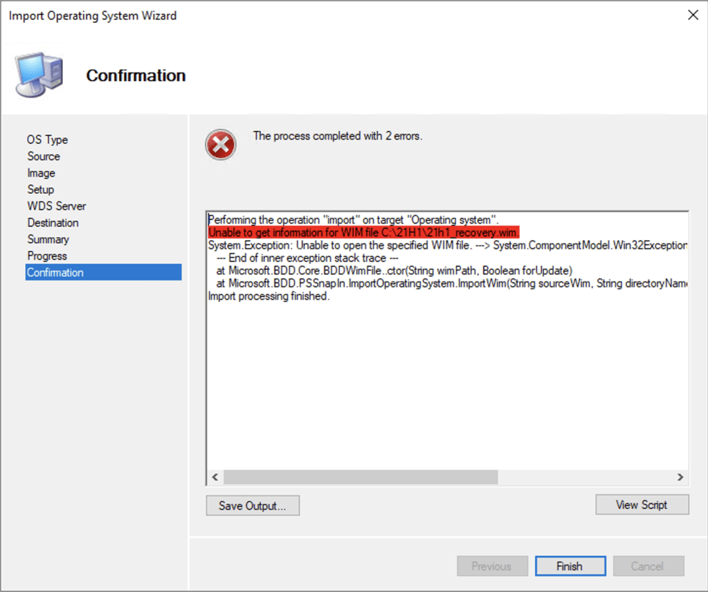 It failed very quickly because it’s trying to extract the registry file to look at what languages are included in the OS, but that won’t work. So we can’t import the recovery/ESD WIM directly. But we can fool it. Let’s first import the original 21H1 WIM file: