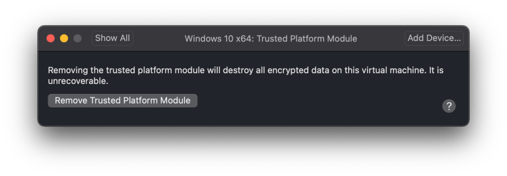 As I noted in a previous blog post, Windows will now enforce the TPM 2.0 requirement for virtual machines with the latest Insider builds. Fortunately, VMware has documented how to do this with an existing VMWare Fusion 12 virtual machine.