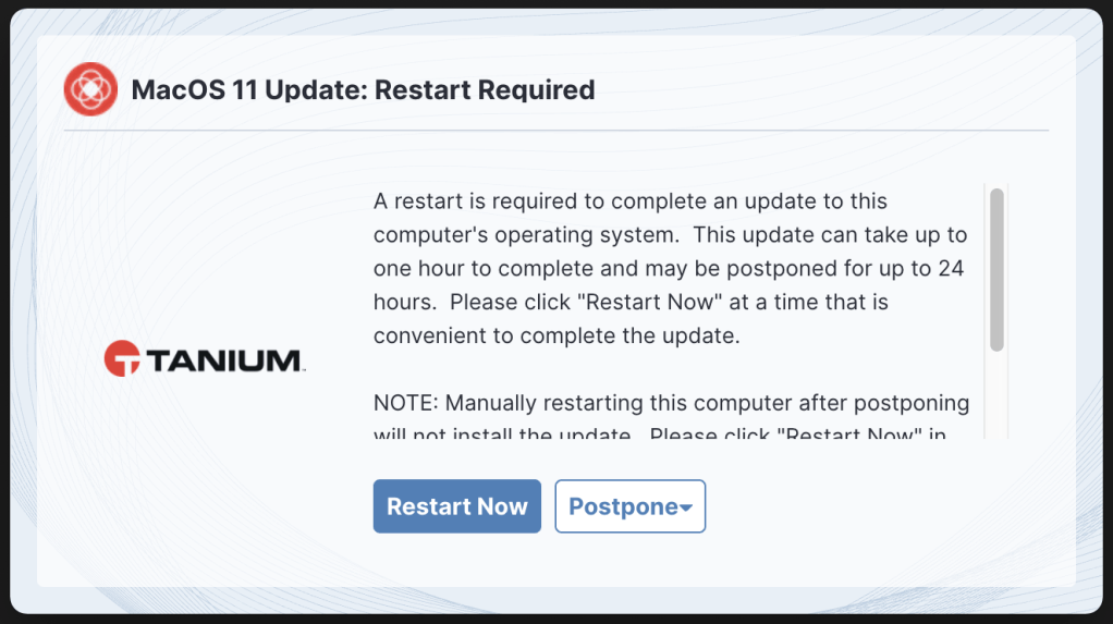 Over the coming months, I’ll probably spend some time diving into each of the capabilities above. For now, I’ll leave you with a picture of the end user experience for the new MacOS patching capability, which is being used on my MacBook Pro to encourage me to restart: