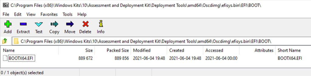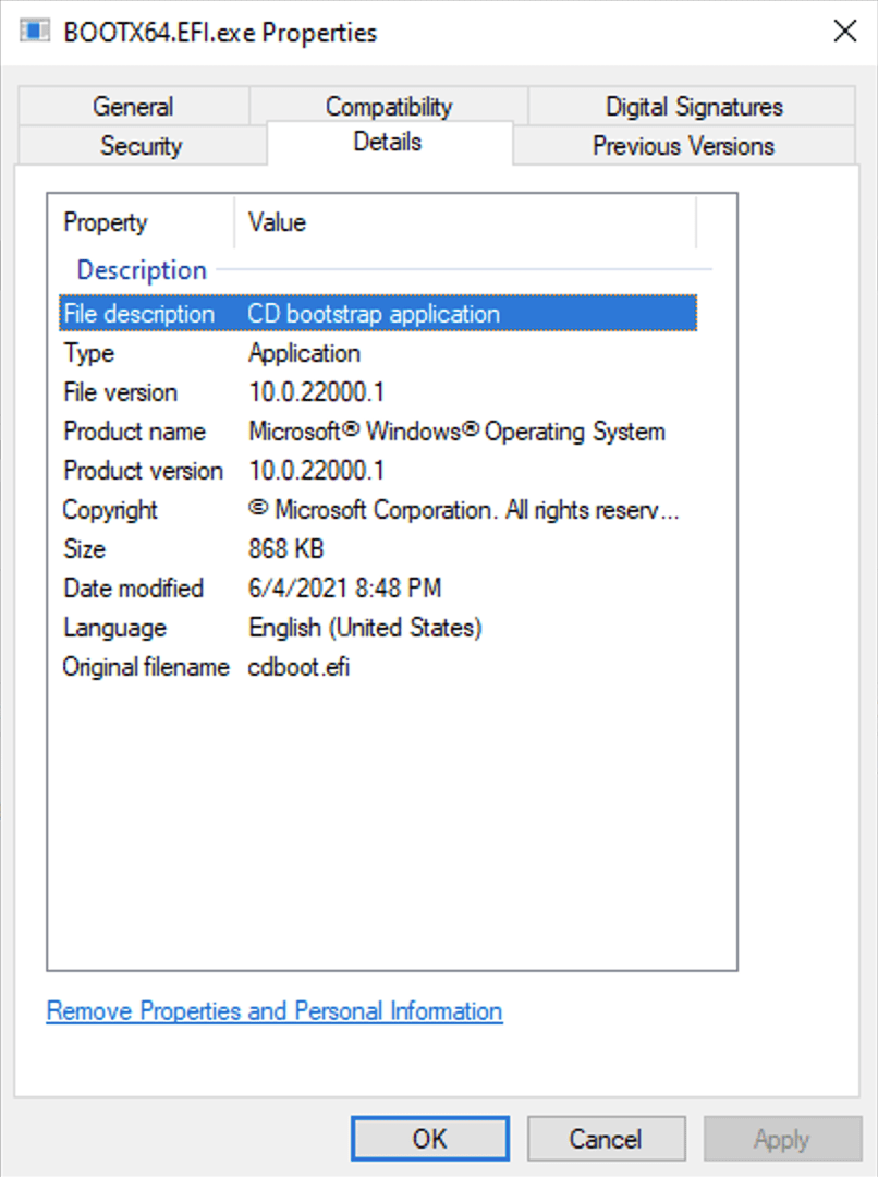 Now it makes perfect sense, the UEFI firmware reads the FAT32 “floppy” from the ISO boot sector, and as with a hard disk or USB, it looks for that EFI\BOOT\BOOTX64.EFI file and executes it. If you extract the file from the image and rename it to have a “.exe” extension, you can look at the file properties: