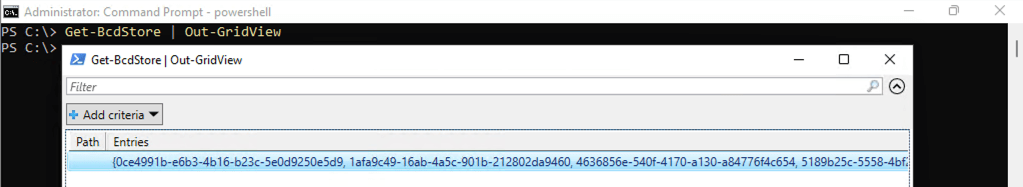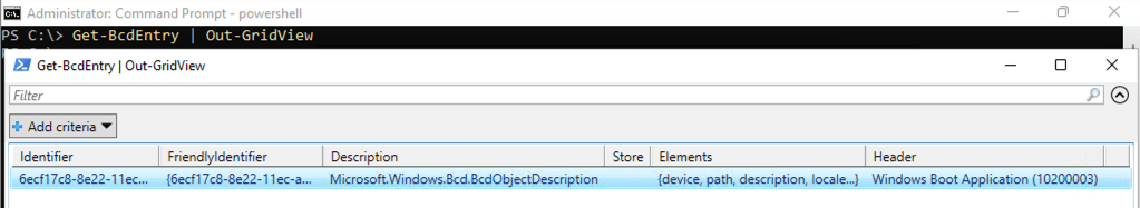 But it’s not ideal, as you then have to inspect the array of elements to see the detail for each one. Doable via some nested loops, e.g. PowerShell code, not as straight-forward to query and manipulate directly. Here’s an example to remove a BCD entry with a specific name:
