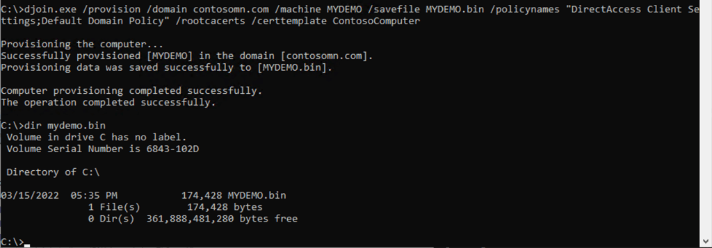 - The resulting blob contains a computer certificate (matching the computer name), trusted root certs, and the GPOs needed to set up DirectAccess, so the machine has connectivity to the corporate network immediately even when on the internet.