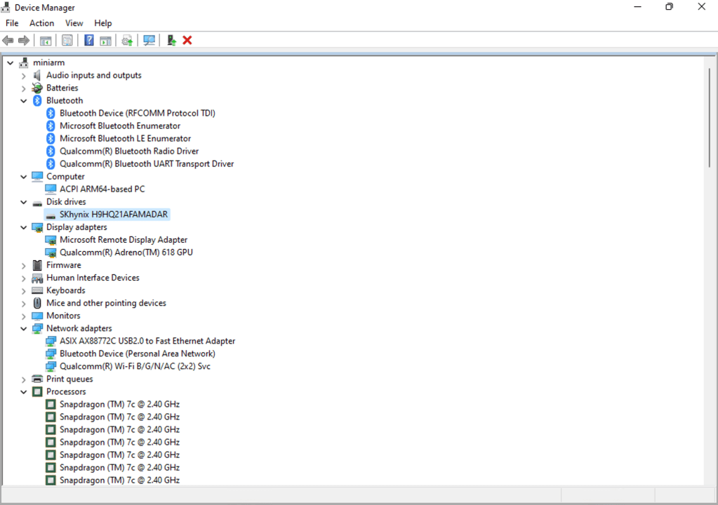 Next, the display adapter is a Qualcomm Adreno 618. Again, entry level graphics, similar to what you would find on an entry-level phone or an older PC (or something with a Pentium Gold or Celeron).