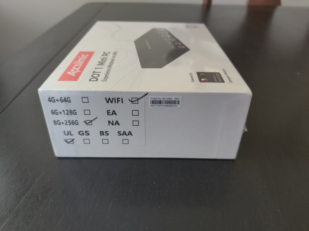 The DOT 1 Mini PC comes in a few different configurations. You can make those out from the side of the box: