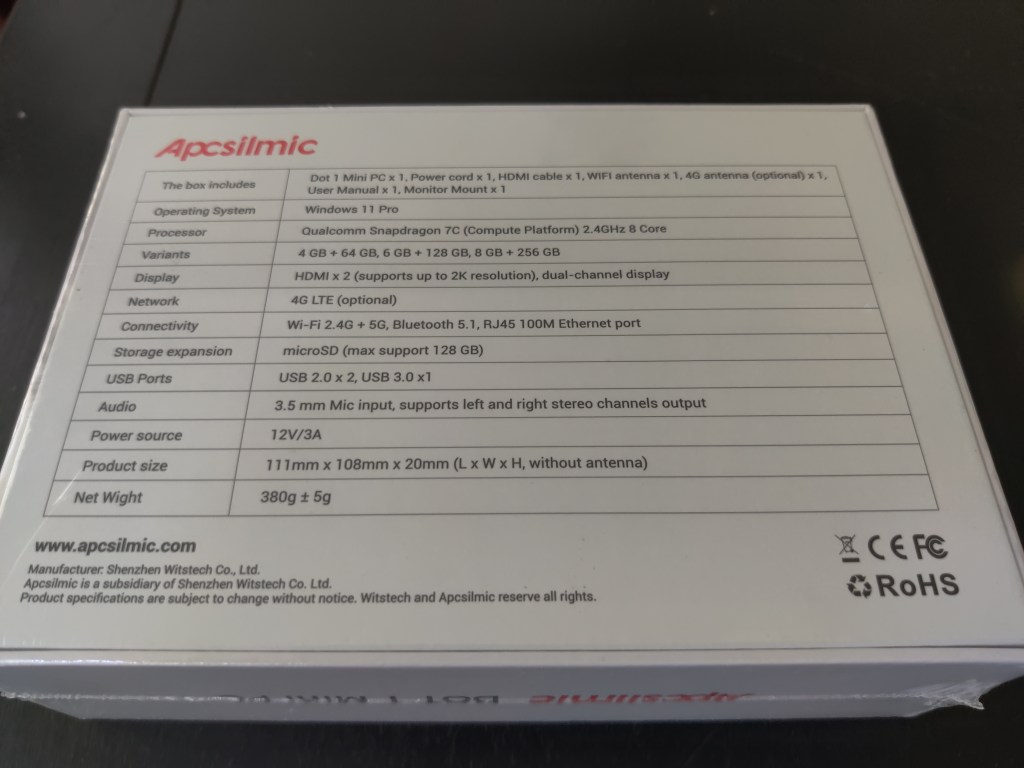 First, there is some company information at the bottom of the box that is a little harder to find on the company’s website. Apcsilmic is a subsidiary of Shenzhen Witstech Co. Ltd. Who are they? They are described on this page as a “global supplier of intelligent terminal key components for smart terminals.” OK, they’re in the IoT/specialized device space, not really in the retail PC space. No big surprise there, as everything about the device points to those sorts of use cases. But looking at the parent company’s website, there is no mention of PCs, just e-ink displays like you would see on shelves at supermarkets that display product prices (updated using phone apps). Well, I guess they make PCs now too.