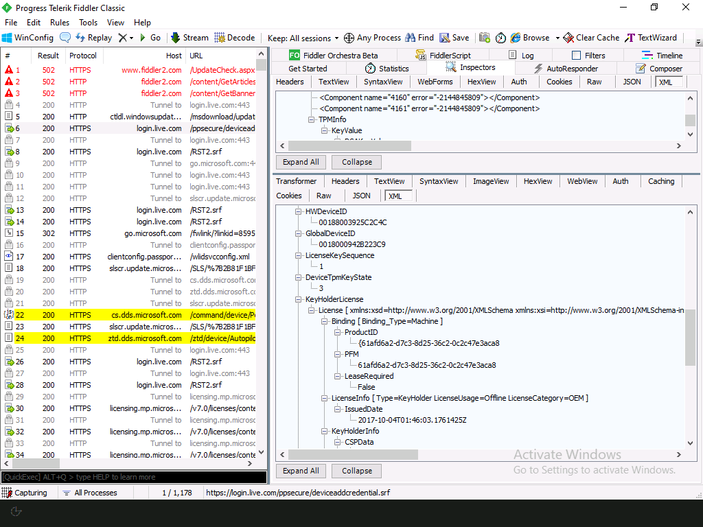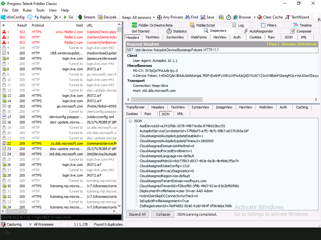 Going back even further in the blog archive, I posted about using Fiddler to watch the network traffic generated during OOBE. In theory, I can use this same technique to see what was going on prior to what I looked at in that previous post. (One quick note: If you try this approach with Windows 11, you won’t see any network traffic from the key components that run during OOBE. This is caused by a “tweak” in Windows 11 OOBE: Instead of the machine OOBE process running as the Administrator account, it runs as defaultUser0. So when you exclude UWP apps in Fiddler to allow them to communicate with the loopback proxy server that Fiddler uses, you miss half of the apps that are needed. Prior to Windows 11, it didn’t switch to defaultUser0 until user OOBE. Not sure why this change was made, or where it is documented, but it does impact scenarios like this where you’re trying to capture network traffic from UWP apps, like the OOBE components. Hence I used Windows 10 for this post.)