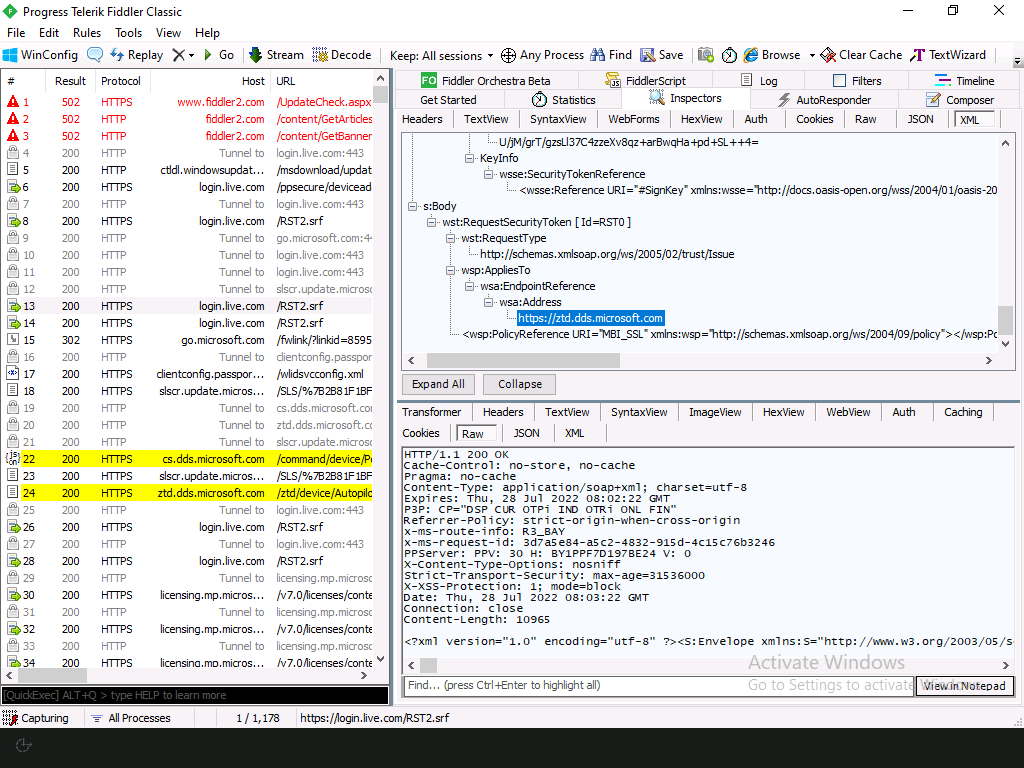 More “antiqueness” in that: SOAP requests, oasis-open.org references, etc. Think “precursor to MSA and AAD.” (There is similar code on GitHub, going back to the Passport SDK days.) And somewhere in the response is likely something usable to create the device token (one of these days, maybe I’ll figure out where), which is provided in the headers for the request to the Autopilot service: