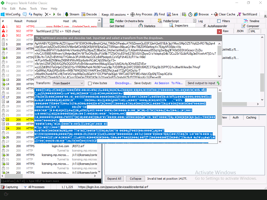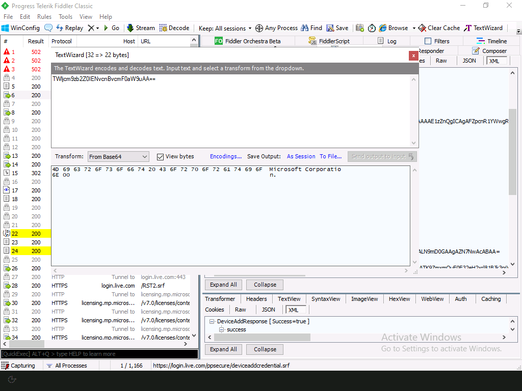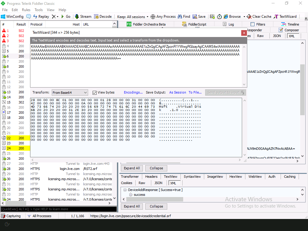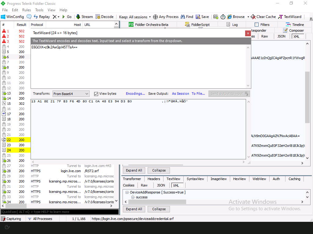 But what do those DeviceInfo strings represent? Each is a base64-encoded string, so we can use Fiddler to decode them one by one, and then try to figure it out by looking at them: