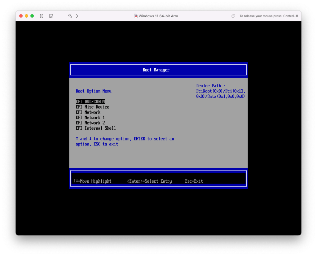 And USB booting still works fine, so maybe that’s another alternative to install Windows 11? Easy enough to try, let’s copy the contents of the Windows 11 arm64 ISO (the one that Parallels downloaded) to a FAT32-formatted USB key, and then see if we can boot from that.