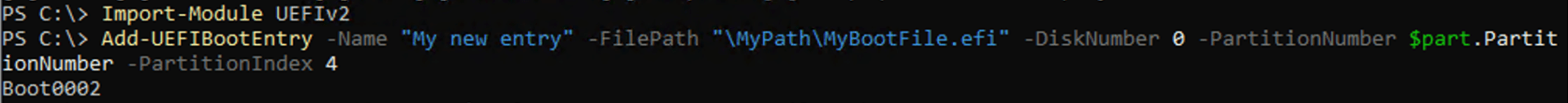 So how do you avoid this without that extra reboot? Well, the simplest way is by modifying the Add-UEFIBootEntry cmdlet to have a new parameter so that you can specify both the partition number (to find the partition object, needed to get the partition signature, size, offset, etc. — all the details that are needed by a boot entry) and the partition index (needed to specify where its at on the disk, the partition number in the UEFI spec). With that in place, I can tell it what exactly I want: