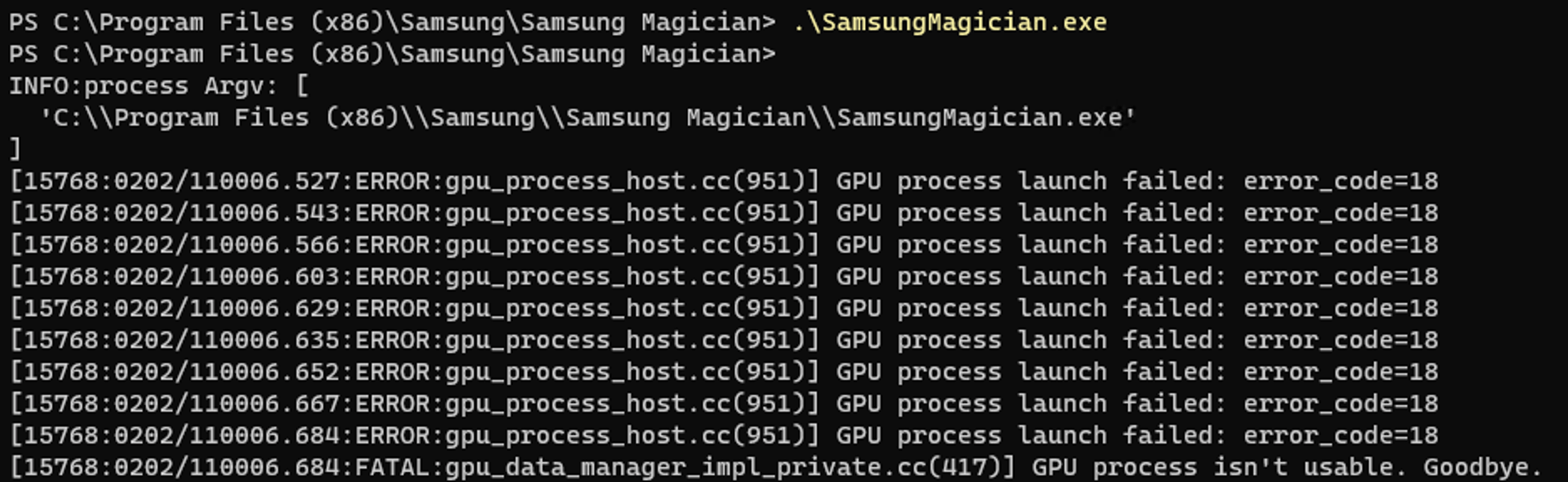 Weirdly, as I was going through this silly process, I got to a point where Samsung Magician wouldn’t launch any more — you would see the icon in the task bar, but then it would disappear and Event Viewer would show an app crash: