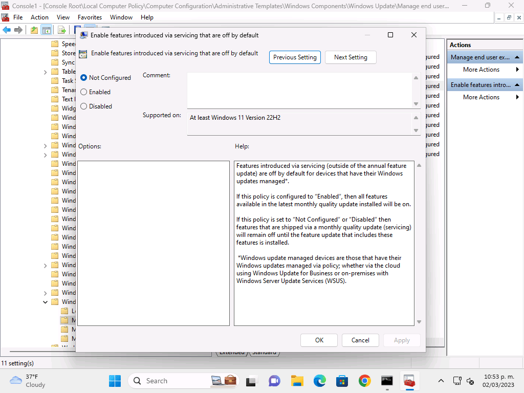 So if you want to keep these new features turned off for machines in your environment, you really don’t have much time. To get the new GPO setting, you can get the updated WindowsUpdate.admx and corresponding WindowsUpdate.adml files (found in C:\Windows\PolicyDefinitions) by installing KB5022913 on a computer running Windows 11 22H2 (which could enable the “moment” features, as it did on my AD-joined test VM that did not have WSUS or WUfB policies applied); from there, you can add it to your Group Policy central store to enable you to set the new policy: