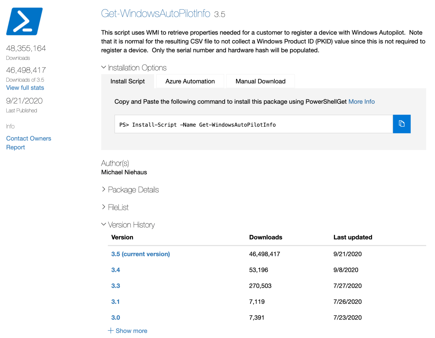 48 million total downloads. Yikes. So you would think that something used so often would actually get some attention. Since I no longer work at Microsoft and haven’t since shortly after version 3.5 was published (had to get that one done before I left), I can’t update it any more — only Microsoft people can. But in over two years, no changes. Not a big deal I guess, as I had piled in the features before I left (anything to encourage Autopilot adoption) and nothing broke — until now.