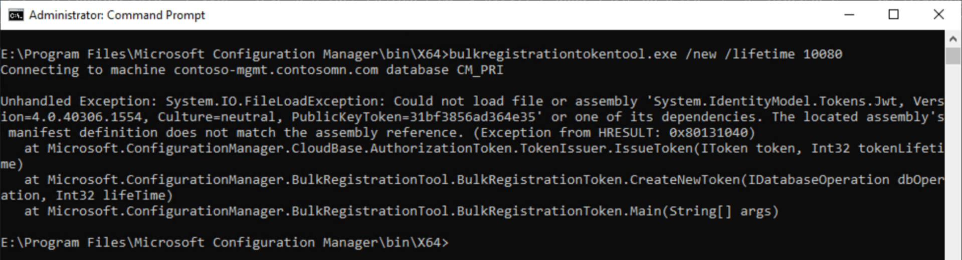 First, I had to get past an installation issue. It appears that somewhere in my many Tech Preview build installs, the bulkregistrationtokentool.exe binary was updated, but the dependent DLLs were not, resulting in this error when trying to run the tool: