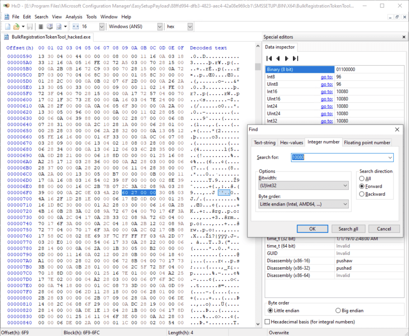 We know it is a 32-bit value (the decompiling shows it is of type “int”, which is four bytes), so we can tell HxD to search for any four bytes containing the value 10080, and it only finds one which makes things simple. Let’s make that much bigger. The bytes are in reverse order, so if we put in something like “ff ff ff 7f” we should get a very large positive integer.
