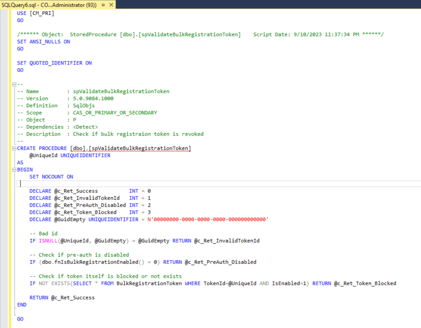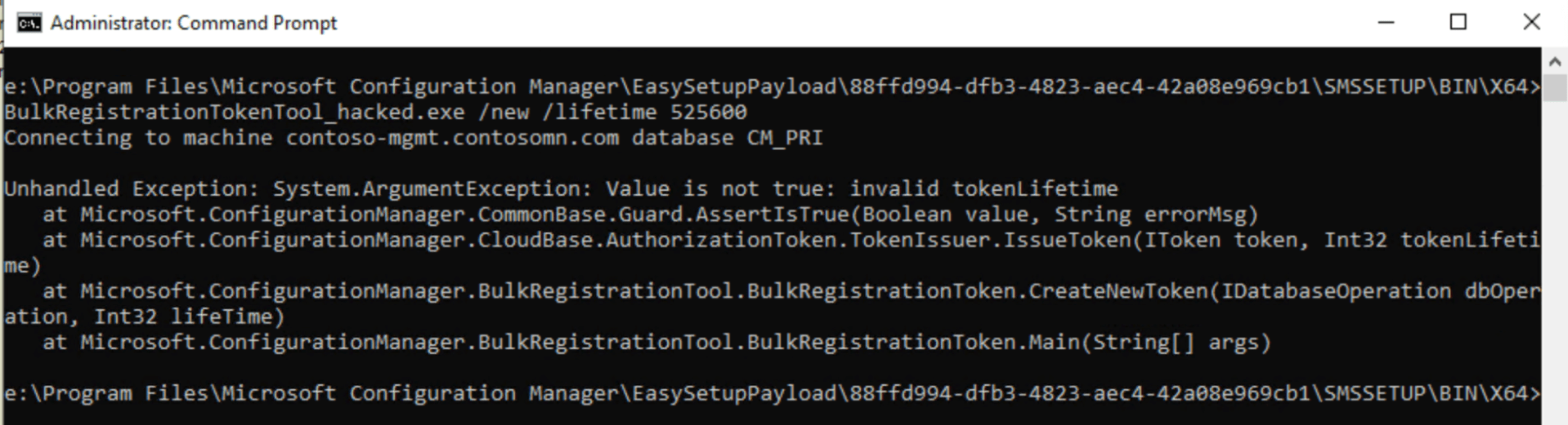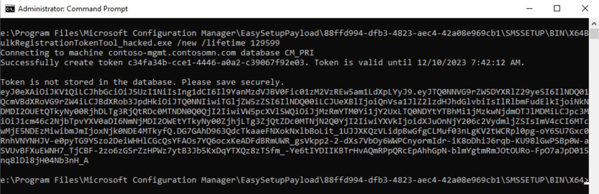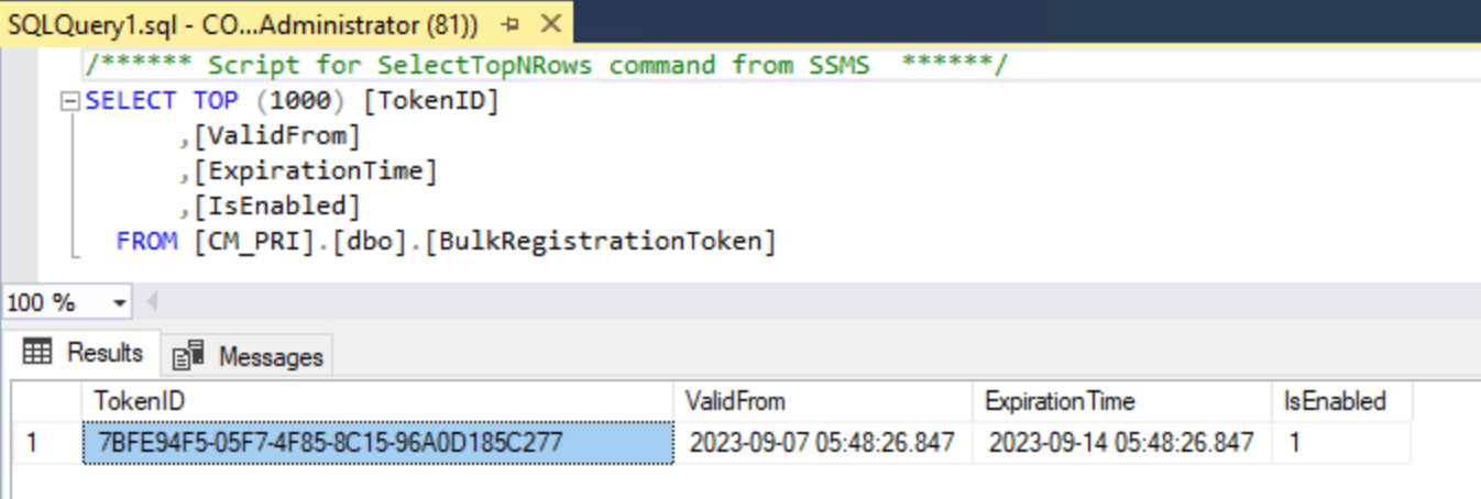 So how do these work? In this implementation, the tool records the token’s unique ID value (as seen above), along with the starting and ending validity information into the site server’s SQL Server database, inserting it into the BulkRegistrationToken table:
