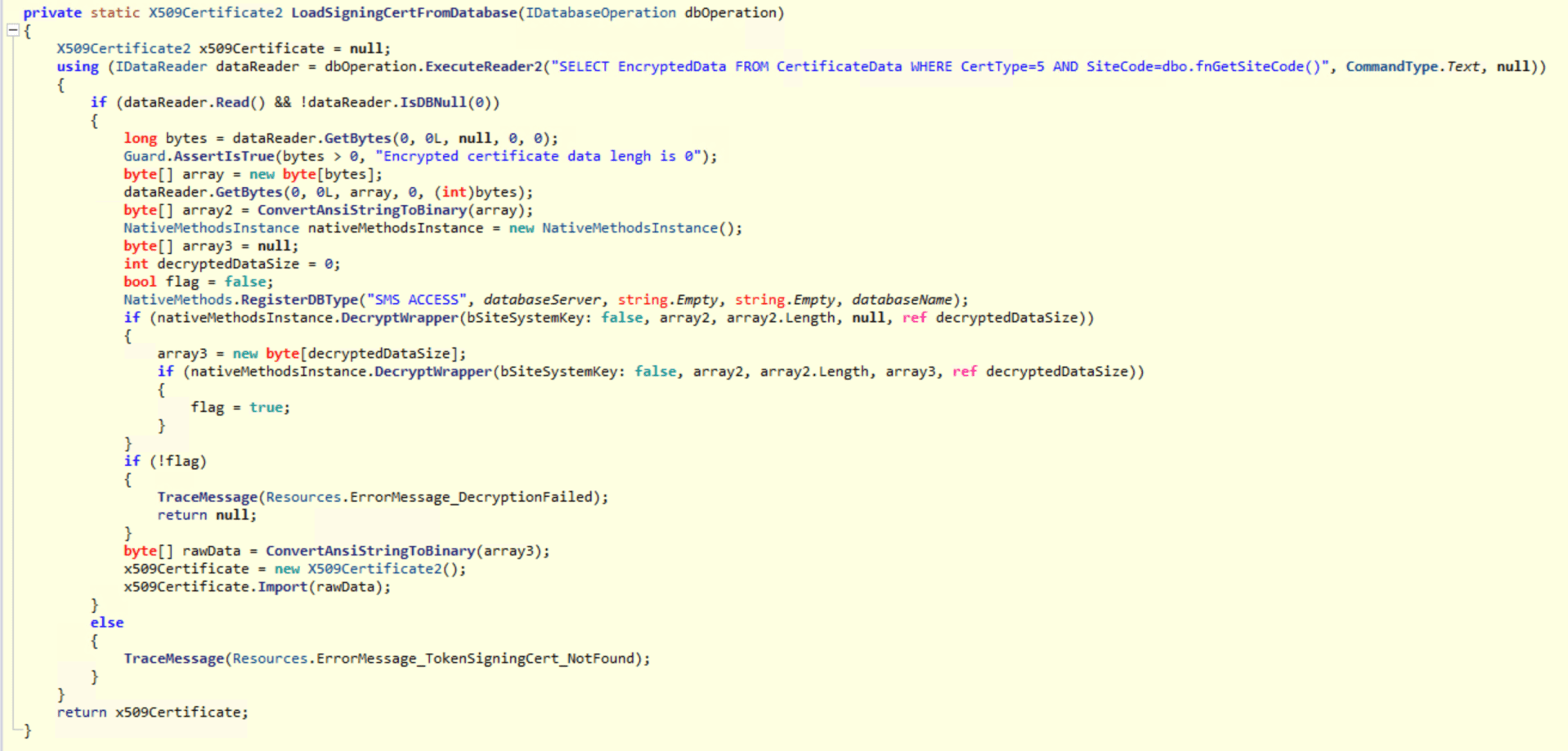 So it’s stored in the site server database in the CertificateData table, with CertType=5. That’s the last one we see (no idea what the other two are for, but that’s not important at the moment):