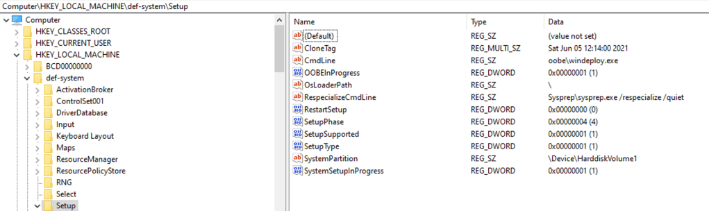 This one took some detailed registry comparison to figure out. Here’s what the HKLM\System\Setup key looks like on standard Windows media: