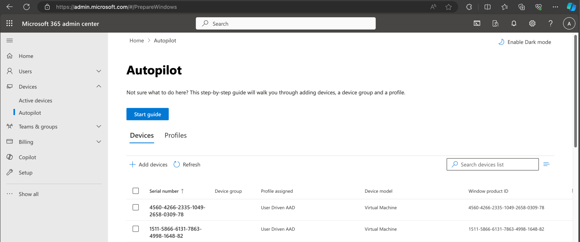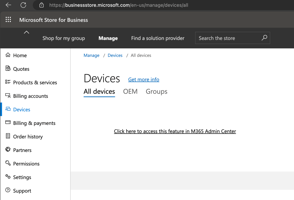 But the actual M365 Admin Center page still exists, at the moment at least, with the same functionality as the Store for Business. You can access that from https://admin.microsoft.com, under Devices -> Autopilot: