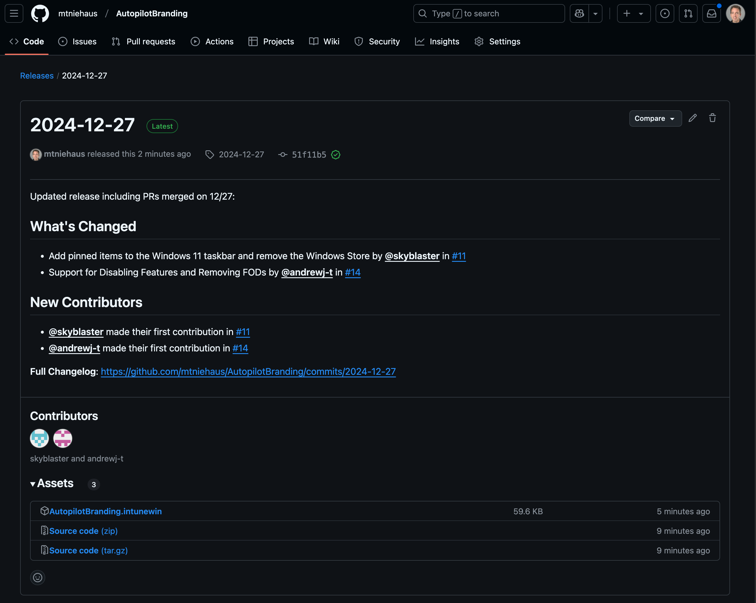 I have merged in changes from the community to create a new release on GitHub, which you can find here: https://github.com/mtniehaus/AutopilotBranding/releases/tag/2024-12-27 You can find the release notes on the release itself: Follow the links to the pull requests (#11, #14) for full details. (It’s worth noting that the “remove the Windows Store” item above refers … Continue reading New release of Autopilot Branding available