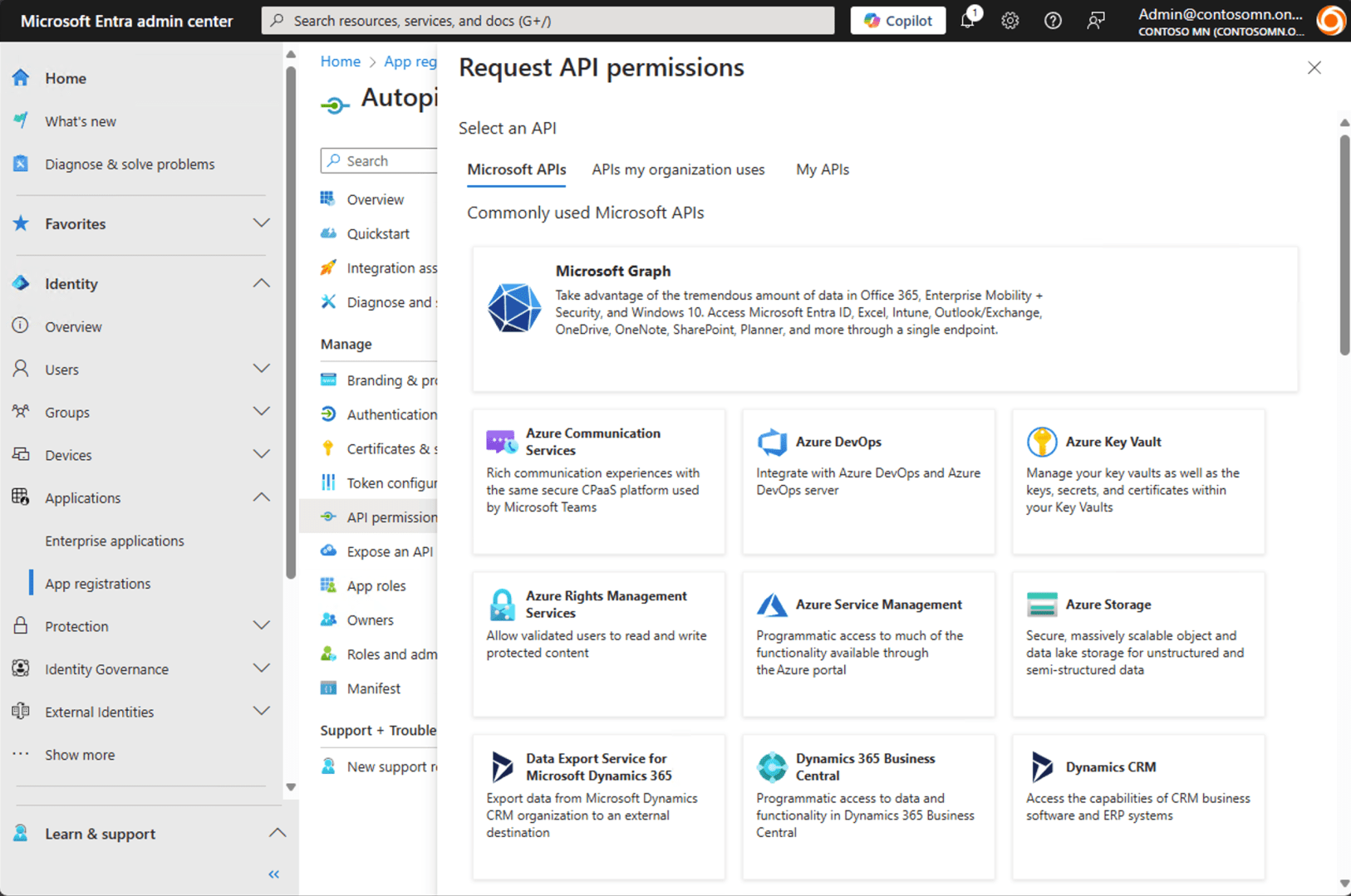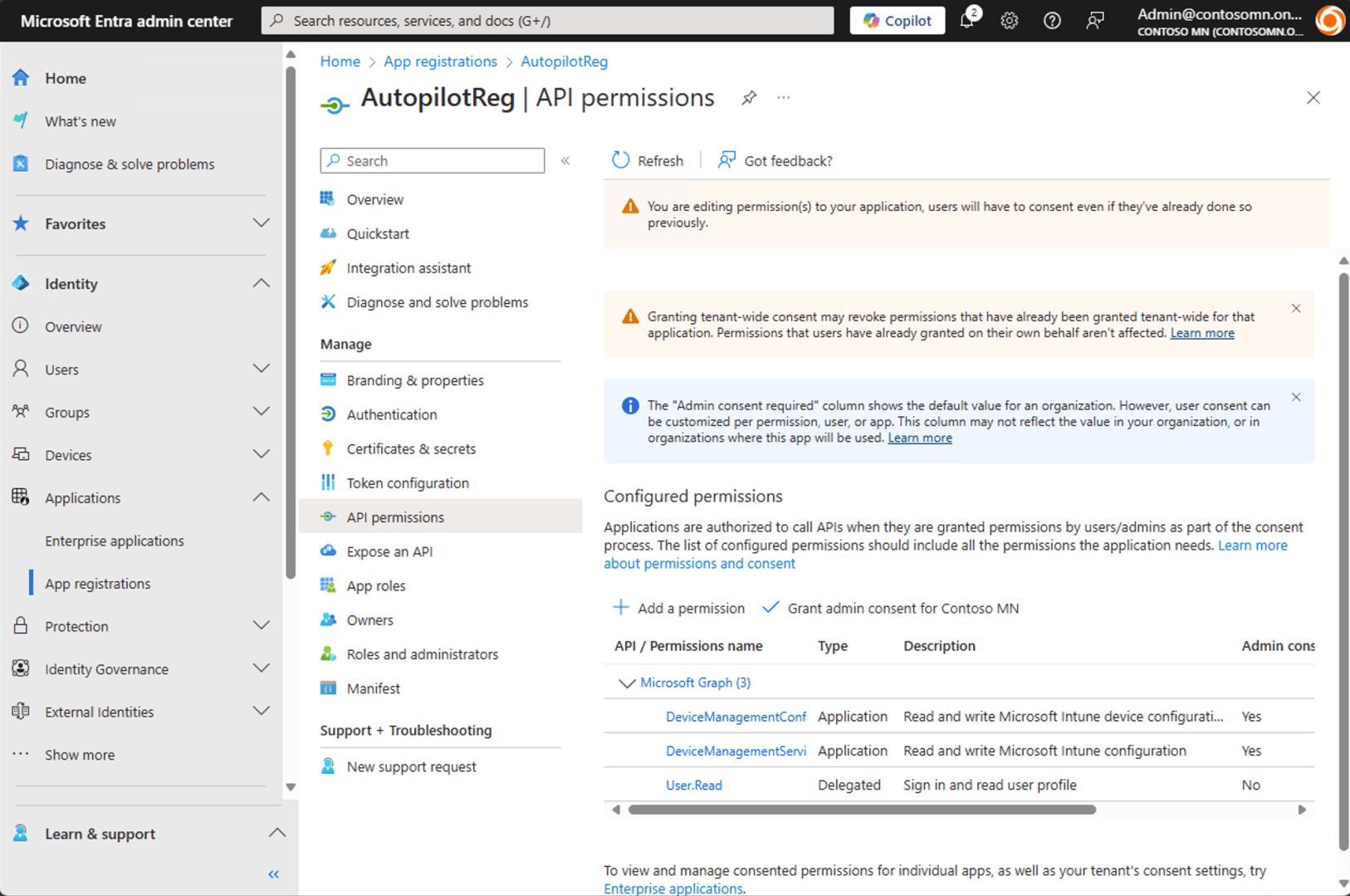 After adding, you need to grant admin consent — if you don’t have the rights to do that, find an administrator that can. Fortunately, I’m the Global Administrator of my tenant, so I can click the “Grant admin consent for Contoso MN” button: