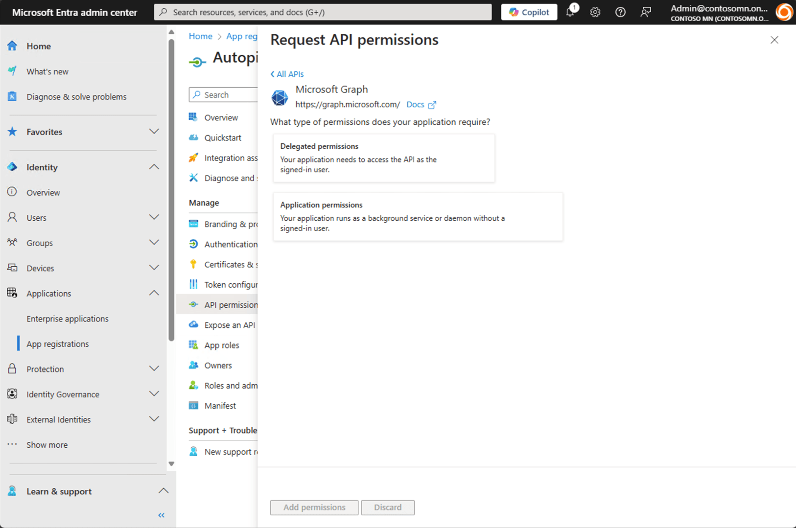 You can easily use one app to do either (since one is a superset of the other). Click “+ Add a permission” and click on “Microsoft Graph” at the top. (Don’t choose “Intune” further down.)