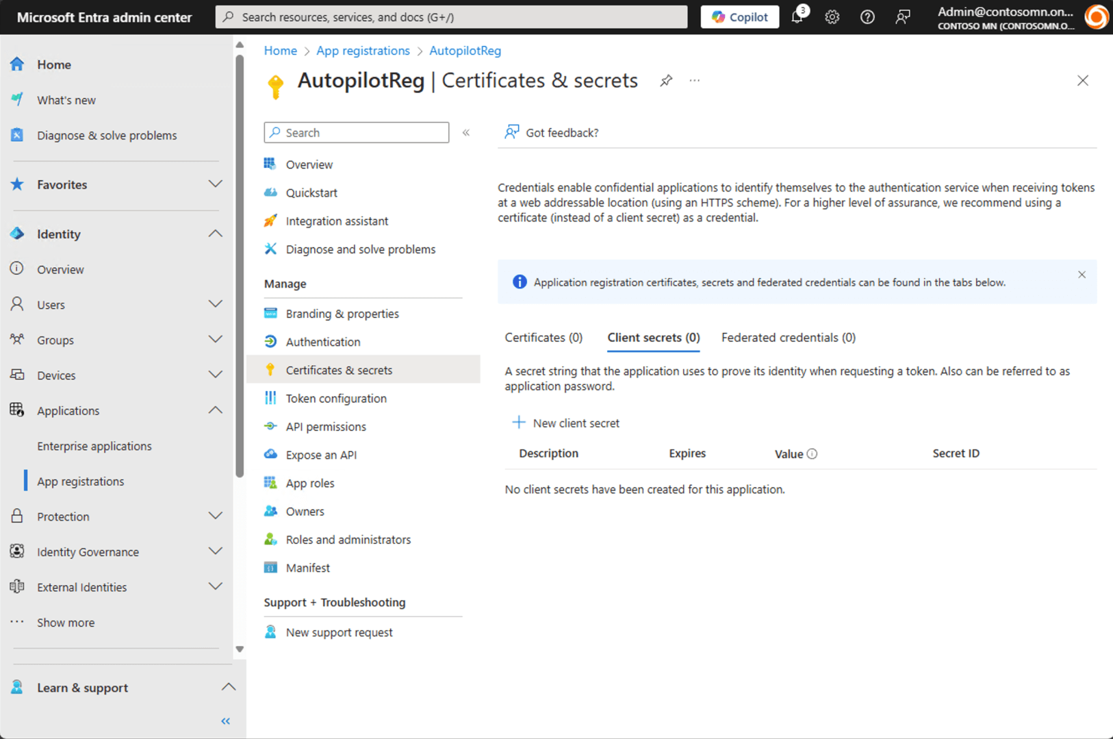 You need to be able to authenticate to Microsoft Graph in order to interact with Intune to perform either type of registration. Since we want to automate this process, we don’t want to have to log in with a username and password. Instead, we want to use an app secret. Let’s create one using the (new-ish?) https://entra.microsoft.com portal. (I have to break the habit of using https://portal.microsoft.com. Plus the Entra portal is prettier.)